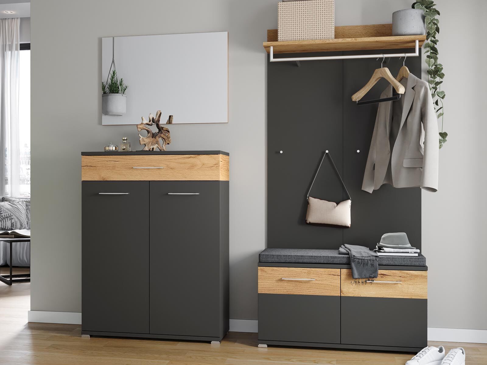 Vous souhaitez rendre votre hall d'entrée complètement branché et tendance ? Combinez alors le porte-manteaux WOODY avec le meuble à chaussures ou le miroir assorti !